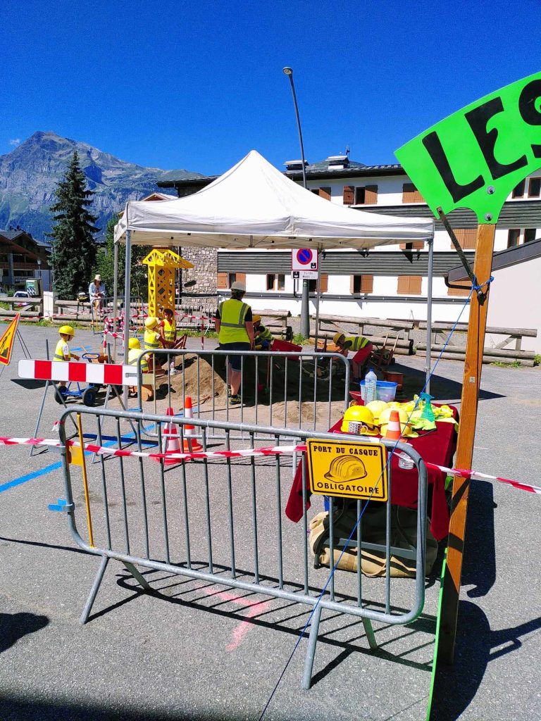 Une fois pendant des vacances nous étions tombé sur un petit chantier BTP pour les enfants : ils s’amusaient en tenue de BTP avec un tas de sable et des machines miniatures, avec un adulte pour vérifier que tout se passe bien. Voici une photo :